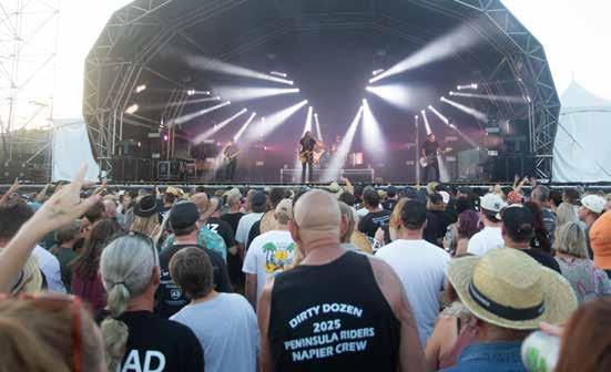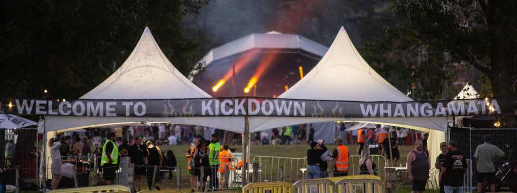 eld over the extended Waitangi Day weekend, the Kickdown Festival near Whangamata was music on steroids and much more. The crowd could enjoy freestyle motorbike shows, road bike and adventure bike competitions along with one of the best riding routes in the Southern Hemisphere. Plenty more for bikes enthusiasts with FMX Displays, a Hill Climb and a popular Legends ride. But it wasn’t all about bikes as there were trade displays, an open fire Meat Cook, a display by the NZ Combat School, and Tattoo artists for those who wanted an enduring souvenir. The atmosphere was phenomenal, electric, but also relaxing and laidback. Thousands came, many of them for the three days but the peak crowd was for the Saturday concert featuring five New Zealand rock bands with some special music layers added to the rock music