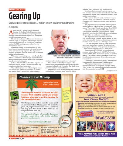 replacing Tasers and batons with smaller models. Straub says the department’s current weapons systems are bulky and inconsistent from officer to officer. He says providing smaller Tasers and batons will make them easier to carry and use. “We want our officers to carry a variety of weapons systems,” Straub said in February. “We want an officer, confronted with a situation, to have as many options as possible.” The department plans to spend $110,600 to provide smaller Tasers for 104 officers now carrying older Taser models. The cost per Taser is equivalent to about $1,060. Officials will also spend about $25,000 to purchase 190 collapsible batons and carrying pouches, costing about $130 each. Another $5,280 will go toward training officers on how to use the new, smaller batons. The department plans to spend an additional $151,000 on a virtual Firearms Training System, an interactive videogame-like simulator, which can present mock law enforcement scenarios on a 360-degree screen. “This new system also allows us to use every weapons system that we have available,” Straub says, from pepper spray to firearms. “This system is also interactive. ... It will actually fire projectiles back at the officer.” Approximately $120,000 will go toward training programs and travel, paying for $42,000 in leadership courses and $30,000 in de-escalation training for Spokane officers. The training is listed as a response to the Use of Force Commission’s concerns about police culture and force practices. Commission Chairman Earl “Marty” Martin says he is encouraged by the department’s initial progress. “The equipment purchases, you can see how those would be easier to do up front,” he says, adding, “They’ve been very enthusiastic about the recommendations the commission has made.” n jacobj@inlander.com