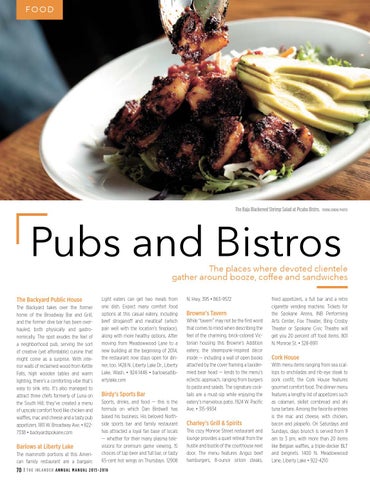 The Backyard Public House The Backyard takes over the former home of the Broadway Bar and Grill, and the former dive bar has been overhauled, both physically and gastronomically. The spot exudes the feel of a neighborhood pub, serving the sort of creative (yet affordable) cuisine that might come as a surprise. With interior walls of reclaimed wood from Kettle Falls, high wooden tables and warm lighting, there’s a comforting vibe that’s easy to sink into. It’s also managed to attract three chefs formerly of Luna on the South Hill; they’ve created a menu of upscale comfort food like chicken and waffles, mac and cheese and a tasty pub appetizers. 1811 W. Broadway Ave. • 8227338 • backyardspokane.com