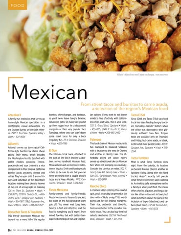 ian options. If you want to eat dinner amidst a hive of activity with bottomless chips and salsa, this is your joint. 1227 S. Grand Blvd., Spokane • Wash. • 455-7117 | 2605 N. Fourth St., Coeur d’Alene • Idaho • 208-665-2400