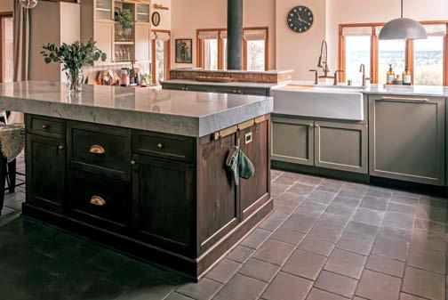 Using cement pavers for the kitchen floor not only creates a rustic look, it’s also practical for a family with two dogs.