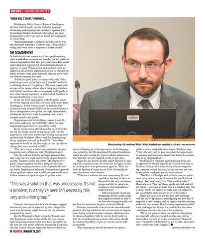 NEWS | GOVERNMENT “WHEN WILL IT OPEN?,” CONTINUED... Washington Policy Center’s Eastern Washington director, Chris Cargill, says he finds that language threatening and inappropriate. Similarly, Spokane City Councilman Michael Cathcart, who helped put open bargaining to a city vote, says he found the language to be concerning. “Bullying language is definitely not the way to win this rhetorical argument,” Cathcart says. “The public is saying they want more transparency in this process.”
