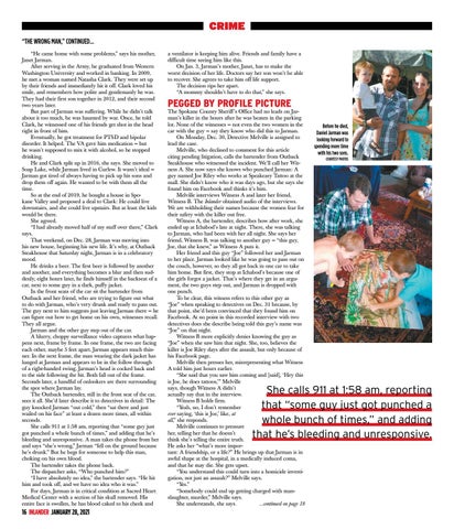 “THE WRONG MAN,” CONTINUED... “He came home with some problems,” says his mother, Janet Jarman. After serving in the Army, he graduated from Western Washington University and worked in banking. In 2009, he met a woman named Natasha Clark. They were set up by their friends and immediately hit it off. Clark loved his smile, and remembers how polite and gentlemanly he was. They had their first son together in 2012, and their second two years later. But part of Jarman was suffering. While he didn’t talk about it too much, he was haunted by war. Once, he told Clark, he witnessed one of his friends get shot in the head right in front of him. Eventually, he got treatment for PTSD and bipolar disorder. It helped. The VA gave him medication — but he wasn’t supposed to mix it with alcohol, so he stopped drinking. He and Clark split up in 2016, she says. She moved to Soap Lake, while Jarman lived in Curlew. It wasn’t ideal — Jarman got tired of always having to pick up his sons and drop them off again. He wanted to be with them all the time. So at the end of 2019, he bought a house in Spokane Valley and proposed a deal to Clark: He could live downstairs, and she could live upstairs. But at least the kids would be there. She agreed. “I had already moved half of my stuff over there,” Clark says. That weekend, on Dec. 28, Jarman was moving into his new house, beginning his new life. It’s why, at Outback Steakhouse that Saturday night, Jarman is in a celebratory mood. He drinks a beer. The first beer is followed by another and another, and everything becomes a blur and then suddenly, eight hours later, he finds himself in the backseat of a car, next to some guy in a dark, puffy jacket. In the front seats of the car sit the bartender from Outback and her friend, who are trying to figure out what to do with Jarman, who’s very drunk and ready to pass out. The guy next to him suggests just leaving Jarman there — he can figure out how to get home on his own, witnesses recall. They all argue. Jarman and the other guy step out of the car. A blurry, choppy surveillance video captures what happens next, frame by frame. In one frame, the two are facing each other, maybe 5 feet apart. Jarman appears much thinner. In the next frame, the man wearing the dark jacket has lunged at Jarman and appears to be in the follow through of a right-handed swing. Jarman’s head is cocked back and to the side following the hit. Both fall out of the frame. Seconds later, a handful of onlookers are there surrounding the spot where Jarman lay. The Outback bartender, still in the front seat of the car, sees it all. She’d later describe it to detectives in detail: The guy knocked Jarman “out cold,” then “sat there and just wailed on his face” at least a dozen more times, all within seconds. She calls 911 at 1:58 am, reporting that “some guy just got punched a whole bunch of times,” and adding that he’s bleeding and unresponsive. A man takes the phone from her and says “she’s wrong,” Jarman “fell on the ground because he’s drunk.” But he begs for someone to help this man, choking on his own blood. The bartender takes the phone back. The dispatcher asks, “Who punched him?” “I have absolutely no idea,” the bartender says. “He hit him and took off, and we have no idea who it was.” For days, Jarman is in critical condition at Sacred Heart Medical Center with a section of his skull removed. His entire face is swollen, he has blood caked to his cheek and
