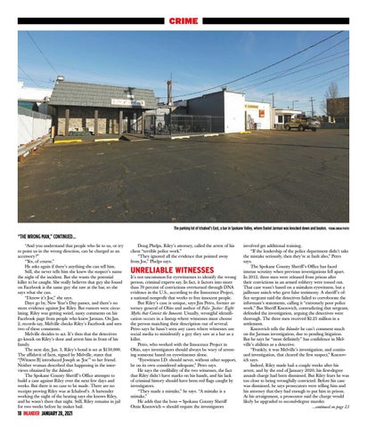 involved get additional training. “If the leadership of the police department didn’t take the mistake seriously, then they’re at fault also,” Petro says. The Spokane County Sheriff’s Office has faced intense scrutiny when previous investigations fell apart. In 2012, three men were released from prison after their convictions in an armed robbery were tossed out. That case wasn’t based on a mistaken eyewitness, but a jailhouse snitch who gave false testimony. A sheriff’s office sergeant said the detectives failed to corroborate the informant’s statements, calling it “extremely poor police work.” But Sheriff Knezovich, contradicting that sergeant, defended the investigation, arguing the detectives were thorough. The three men received $2.25 million in a settlement. Knezovich tells the Inlander he can’t comment much on the Jarman investigation, due to pending litigation. But he says he “most definitely” has confidence in Melville’s abilities as a detective. “Frankly, it was Melville’s investigation, and continued investigation, that cleared the first suspect,” Knezovich says. Indeed, Riley made bail a couple weeks after his arrest, and by the end of January 2020, his first-degree assault charge had been dismissed. But Riley fears he was too close to being wrongfully convicted. Before his case was dismissed, he says prosecutors were telling him and his attorney that they had enough to put him in prison. At his arraignment, a prosecutor said the charge would likely be upgraded to second-degree murder. ...continued on page 23