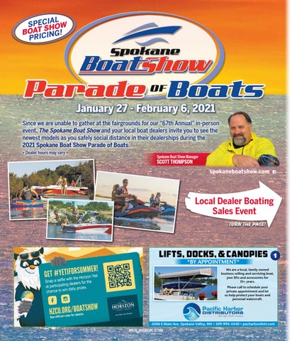 January 27 - February 6, 2021 Since we are unable to gather at the fairgrounds for our “67th Annual” in-person event, The Spokane Boat Show and your local boat dealers invite you to see the newest models as you safely social distance in their dealerships during the 2021 Spokane Boat Show Parade of Boats. • Dealer hours may vary •