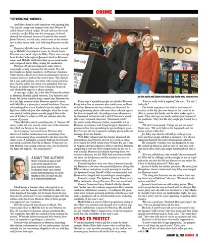 “THE WRONG MAN,” CONTINUED... And Riley doesn’t credit detectives with clearing him. The assault charge was dropped only after Witness B called detectives back on Jan. 28 and said that she made a mistake and Joe Riley was the wrong guy. A friend showed the witnesses pictures of someone else named Jamie Peterson, records state, and as soon as the women saw it, their hearts sank, now believing Peterson was the guy. Detective Melville knew of Peterson. In fact, according to Melville’s investigation notes, he already knew Peterson was a dead ringer for Riley. There was a receipt from Ichabod’s the night of Jarman’s death in Peterson’s name, and Melville had looked him up on social media and compared him to Riley, noting the similarities. Peterson, 39, did not respond to calls, texts or voicemails seeking comment for this article. Nor did his friends and family members. At Peterson’s Spokane Valley home, a block away from an elementary school, a woman answered and said he wasn’t there. The Inlander left a note and business card there with contact information. Shortly before this article was published, Peterson blocked an Inlander reporter from seeing his Facebook and blocked the reporter’s phone number. A year ago, on Jan. 29, a day after Witness B pointed to Peterson, Melville called Peterson. The detective had found his phone number from a report that Peterson was in a bar fight months earlier. Peterson agreed to meet with Melville at a pizza place around lunchtime. Peterson acknowledged he was at Ichabod’s bar the night of the fight but said he left just after midnight, when his receipt was printed. In fact, phone records pegged him in the area of Ichabod’s as late as 2:03 am, minutes after the assault of Jarman. Then Melville noticed something else: A “lasered off” tattoo on his left arm, exactly where one of the witnesses described one being on the suspect. As investigators narrowed in on Peterson, they discovered that his involvement was something of an open secret among those connected to the bars near the crime scene. A bartender at nearby Sullivan Scoreboard answered a call from Melville in March. When she was told Melville was seeking someone who was involved in the fight, she replied, “You mean Jamie?”