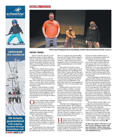 hexameter rhythms of Homer but in a much more conversational, modern style that makes it easy for the audience. “The Poet is talking about things like what it’s like to get cut off in traffic, and how rage can take over. It’s not just on the battlefield, but it’s the rage within us,” Hardie says. “I see war on my television set, and in the paper, and I intellectualize war ... But I totally get being cut off in traffic. I get what it does to me personally. There are many moments when the Poet brings it home like that.” Jeremy Whittington, Stage Left’s managing and artistic director, was struck by the play from the moment Tombari pitched it to be part of the theater’s one-person show series, Alone Together. The idea of streaming one-person shows came after Stage Left had success streaming some of its regular festivals as well as a couple of plays. Landing a SAGA grant kicked the idea into gear as part of the way the theater is “rolling with the punches” of the pandemic. Whittington notes that, thanks to that grant, An Iliad will be the first time everyone involved with a Stage Left production will be paid for their work. For the audience, the play offers a way to experience stirring theater while supporting local artists. And with An Iliad, they have a show worth doing both. “It’s that personalization of war that is told very well through this script,” Whittington says. “It’s a beautiful roller-coaster of emotion. It’s done with levity, and with seriousness, and with fun storytelling and tragic storytelling … The point the Poet is trying to make for us is to help us connect so that we might learn something.” n An Iliad • Jan. 29-Feb. 7, Thu-Sat at 7 pm, Sun at 2 pm • $20/$15 for seniors, military and students • Online; tickets and info at showtix4u.com/event-details/44777 and stagelefttheater.org