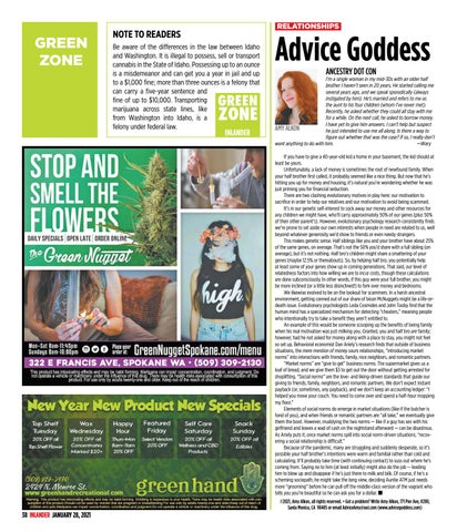 I’m a single woman in my mid-30s with an older half brother I haven’t seen in 20 years. He started calling me several years ago, and we speak sporadically (always instigated by him). He’s married and refers to me as the aunt to his four children (whom I’ve never met). Recently, he asked whether they could all stay with me for a while. On the next call, he asked to borrow money. I have yet to give him answers. I can’t help but suspect AMY ALKON he just intended to use me all along. Is there a way to figure out whether that was the case? If so, I really don’t want anything to do with him. —Wary If you have to give a 40-year-old kid a home in your basement, the kid should at least be yours. Unfortunately, a lack of money is sometimes the root of newfound family. When your half brother first called, it probably seemed like a nice thing. But now that he’s hitting you up for money and housing, it’s natural you’re wondering whether he was just priming you for financial seduction. There are two clashing evolutionary motives in play here: our motivation to sacrifice in order to help our relatives and our motivation to avoid being scammed. It’s in our genetic self-interest to sock away our money and other resources for any children we might have, who’ll carry approximately 50% of our genes (plus 50% of their other parent’s). However, evolutionary psychology research consistently finds we’re prone to set aside our own interests when people in need are related to us, well beyond whatever generosity we’d show to friends or even needy strangers. This makes genetic sense. Half siblings like you and your brother have about 25% of the same genes, on average. That’s not the 50% you’d share with a full sibling (on average), but it’s not nothing. Half bro’s children might share a smattering of your genes (maybe 12.5% or thereabouts). So, by helping half bro, you potentially help at least some of your genes show up in coming generations. That said, our level of relatedness factors into how willing we are to incur costs, though these calculations are done subconsciously. In other words, if this guy were your full brother, you might be more inclined (or a little less disinclined!) to fork over money and bedrooms. We likewise evolved to be on the lookout for scammers. In a harsh ancestral environment, getting conned out of our share of bison McNuggets might be a life-ordeath issue. Evolutionary psychologists Leda Cosmides and John Tooby find that the human mind has a specialized mechanism for detecting “cheaters,” meaning people who intentionally try to take a benefit they aren’t entitled to. An example of this would be someone scooping up the benefits of being family when his real motivation was just milking you. Granted, you and half bro are family; however, had he not asked for money along with a place to stay, you might not feel so set up. Behavioral economist Dan Ariely’s research finds that outside of business situations, the mere mention of money sours relationships, “introducing market norms” into interactions with friends, family, nice neighbors, and romantic partners. “Market norms” are “give to get” business norms. The supermarket gives us a loaf of bread, and we give them $3 to get out the door without getting arrested for shoplifting. “Social norms” are the love- and liking-driven standards that guide our giving to friends, family, neighbors, and romantic partners. We don’t expect instant payback (or, sometimes, any payback), and we don’t keep an accounting ledger: “I helped you move your couch. You need to come over and spend a half-hour mopping my floor.” Elements of social norms do emerge in market situations (like if the butcher is fond of you), and when friends or romantic partners are “all take,” we eventually give them the boot. However, muddying the two norms — like if a guy has sex with his girlfriend and leaves a wad of cash on the nightstand afterward — can be disastrous. As Ariely puts it, once market norms spill into social norm-driven situations, “recovering a social relationship is difficult.” Because of the pandemic, many are struggling and suddenly desperate, so it’s possible your half brother’s intentions were warm and familial rather than cold and calculating. It’ll probably take time (with continuing contact) to suss out where he’s coming from. Saying no to him (at least initially) might also do the job -- leading him to blow up and disappear if he’s just there to milk and bilk. Of course, if he’s a scheming sociopath, he might take the long view, deciding Auntie ATM just needs more “grooming” before he can pull off the middle-class version of the vagrant who tells you you’re beautiful so he can ask you for a dollar. n ©2021, Amy Alkon, all rights reserved. • Got a problem? Write Amy Alkon, 171 Pier Ave, #280, Santa Monica, CA 90405 or email AdviceAmy@aol.com (www.advicegoddess.com)