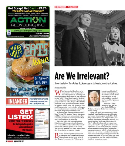 swamp (sound familiar?) by term-limiting legislators, the voters of Eastern Washington went for the bait and voted Foley out of office. So much for Spokane’s influence. First came George Nethercutt, and now we have Cathy McMorris Rodgers, who spent the last four years at the altar of Trump. At the state level, Spokane enjoyed a slight comeback when Lisa Brown went to Olympia and became Senate majority leader. Now Andy Billig holds that same post. Despite all that, our standing in statewide and national politics is rock bottom — a long, predictable fall starting with Foley’s defeat. Our local daily newspaper was among the very few to judge Donald Trump the right choice for four more years. Our congresswoman stands as the only one of Washington state’s representatives in D.C. to believe impeachment is no way to treat a president who manufactures an insurrection against the government. We keep electing people in Spokane Valley who want to form a separate state that would rival Mississippi in its economic prospects.