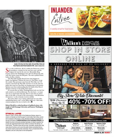 o, as the world turns: All of a sudden the Democrats control the presidency, certainly for the next four years, and the Congress for sure for the next two. Meanwhile, King County ensures that Washington state will vote Democratic and, well, that’s pretty much the ball game. The state’s political future looks a lot like a donkey. The West Side benefits directly from what happens in Seattle, but Spokane? Without the clout of a Tom Foley, we get the crumbs. Our governors come from the West Side, our U.S. senators come from the West Side, but here we see the same impulses that voted out Tom Foley are keeping many in the greater Spokane area from understanding that the health of the City of Spokane is the key to the health of the region. It’s not just that our fellow Washingtonians look over the Cascade curtain at us with bewilderment. No, that hurts — so many of us are so much better than that. But it’s more that we need a place at the table, to be part of the conversation — and allocations of resources — as the economic recovery unfolds. We need to find a way to better understand our own often self-defeating history and — as Joe Biden might say — find some common purpose the way we used to do it. n Robert Herold is a retired professor of political science who taught at both Gonzaga University and Eastern Washington University.