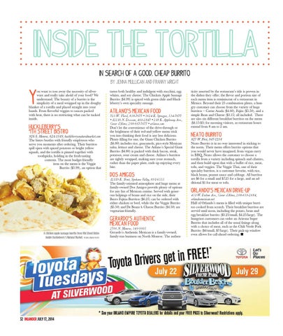 ORLANDO’S MEXICAN DRIVE-UP 451 W. Dalton Ave., Coeur d’Alene, 208-659-2684, orlandosmexican.net Half of Orlando’s menu is filled with unique burritos cooked from scratch. Their breakfast burritos are served until noon, including the potato, bean and egg breakfast burrito ($3.25/small, $4.25/large). The hungriest customers can order an Arizona Super Burrito that includes all of the usual fixings along with a choice of meat, such as the Chili Verde Pork Burrito ($6/small, $7/large). Their pick-up window even allows for call-ahead ordering.