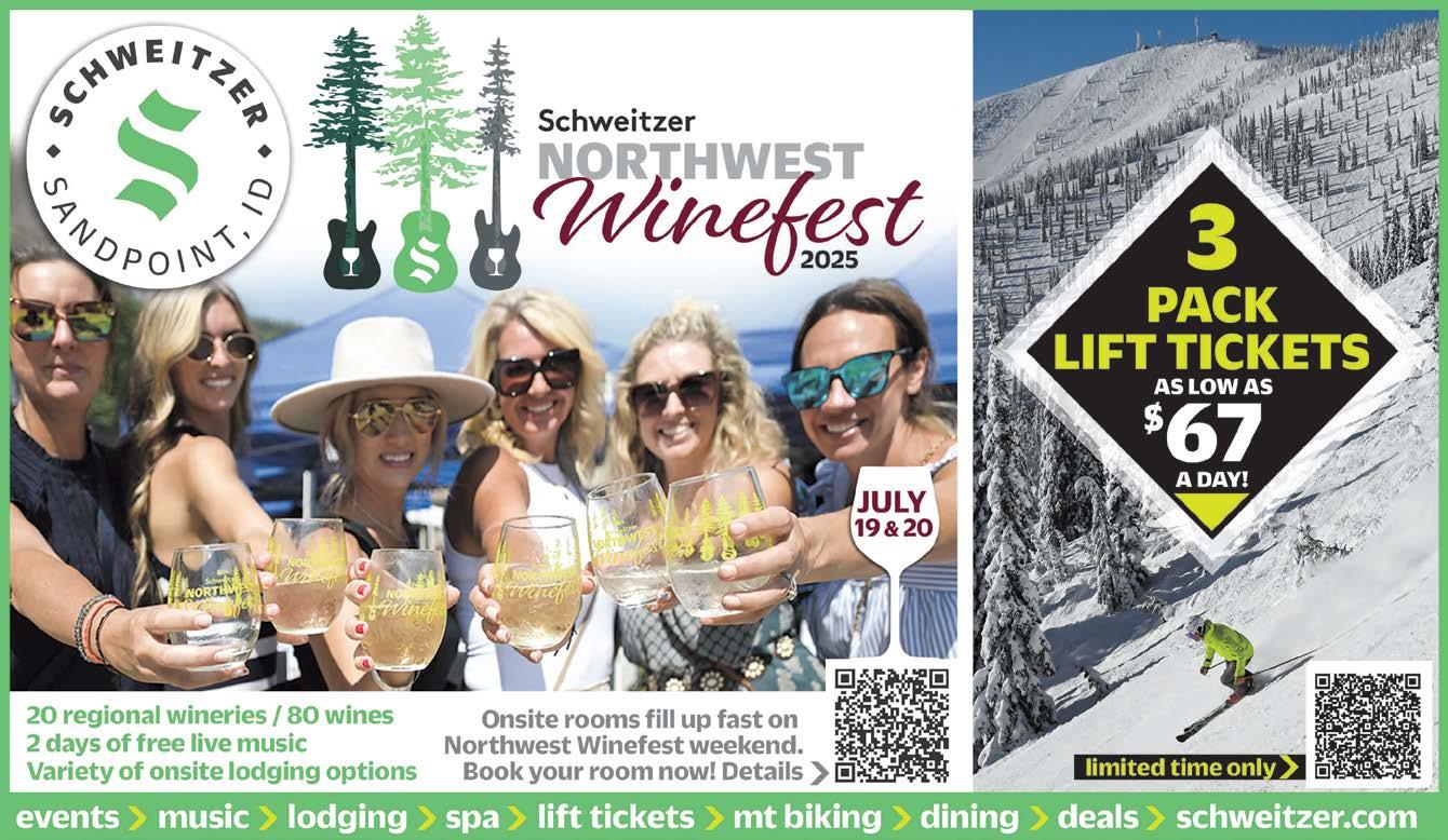 NORTHWEST WINEFEST 2025 Sample wines from around the Pacific Northwest while enjoying local food vendors, mountain activities and live music. July 19-20. Schweitzer, 10,000 Schweitzer Mountain Rd. schweitzer.com (208-263-9555)