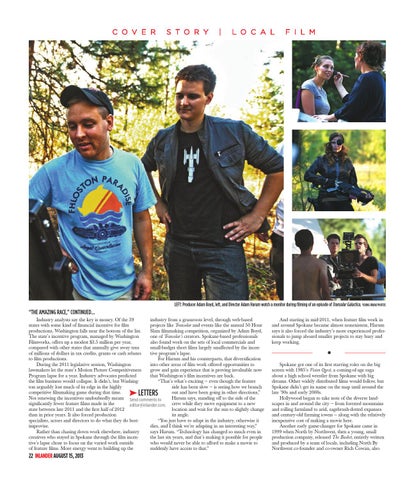“the amazing race,” continued... Industry analysts say the key is money. Of the 39 industry from a grassroots level, through web-based states with some kind of financial incentive for film projects like Transolar and events like the annual 50 Hour productions, Washington falls near the bottom of the list. Slam filmmaking competition, organized by Adam Boyd, The state’s incentive program, managed by Washington one of Transolar’s creators. Spokane-based professionals Filmworks, offers up a modest $3.5 million per year, also found work on the sets of local commercials and compared with other states that annually give away tens small-budget short films largely unaffected by the incenof millions of dollars in tax credits, grants or cash rebates tive program’s lapse. to film productions. For Harum and his counterparts, that diversification During the 2011 legislative session, Washington into other areas of film work offered opportunities to lawmakers let the state’s Motion Picture Competitiveness grow and gain experience that is proving invaluable now Program lapse for a year. Industry advocates predicted that Washington’s film incentives are back. the film business would collapse. It didn’t, but Washing“That’s what’s exciting — even though the feature ton arguably lost much of its edge in the highly side has been slow — is seeing how we branch competitive filmmaking game during that time. out and have been going in other directions,” Not renewing the incentives undoubtedly meant Send comments to Harum says, standing off to the side of the significantly fewer feature films made in the editor@inlander.com. crew while they move equipment to a new state between late 2011 and the first half of 2012 location and wait for the sun to slightly change than in prior years. It also forced production its angle. specialists, actors and directors to do what they do best: “You just have to adapt in the industry, otherwise it improvise. dies, and I think we’re adapting in an interesting way,” Rather than chasing down work elsewhere, industry says Harum. “Technology has changed so much even in creatives who stayed in Spokane through the film incenthe last six years, and that’s making it possible for people tive’s lapse chose to focus on the varied work outside who would never be able to afford to make a movie to of feature films. More energy went to building up the suddenly have access to that.”