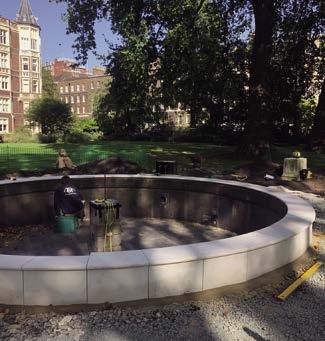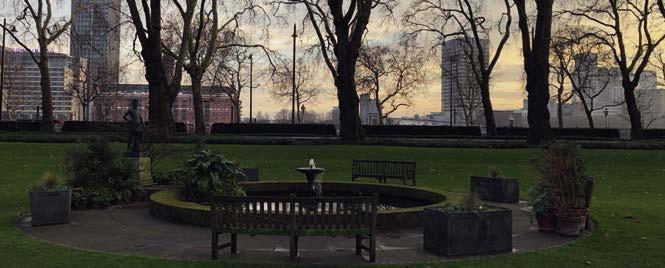 For the new design, the statue of the boy holding the book with the Lamb quote “Lawyers were children once” which had previously been attached to the side of the Pond, has been repositioned into a bed to allow a circular walking route around the water. The Pond brick surround has been replaced with Portland stone to complement the Main Gates and Sundial. The surround has been made slightly thinner and higher to give a more elegant proportion. The paving has also been replaced with CEDEC to marry with the other path surfacing across the Garden. With the area enlarged, it allows different-sized seating alcoves, which are surrounded by planting. The largest seating area faces west towards Big Ben for sunset views and is large enough to accommodate a bench and two armchairs for small groups to socialise.