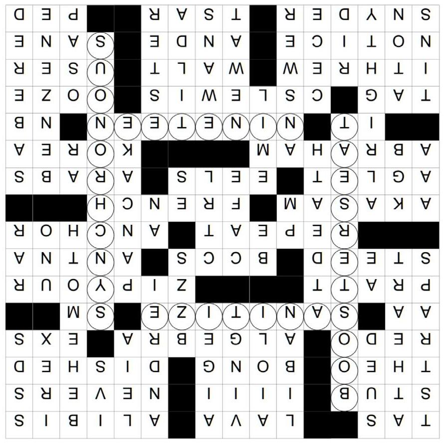 CLUES (ACROSS) 1. Professor helpers 4. Minecraft hot liquid 8. Cover stories 14. Painful thing you can do to your toe 16. 4 in tally marks 17. Definitive negative responses 18. Alternative nickname for Teddy Roosevelt 19. Pipe used to smoke weed 20. Insulted, with “out” 21. Ctrl+Y 22. Math with variables 24. “___ and Oh’s”, 2015 song by Elle King 25. Type of battery 26. What one may be asked to do before entering a building 28. Texting abbr. that means “a lot” 29. Chris of “Guardians of the Galaxy” 31. “___ lips”, expression that means “shut up” 35. Horse 36. Emails discreetly 39. Palindromic abbreviation of “antenna”, maybe 40. Do again 42. Ship stabilizer 43. What you would say when introducing Samantha who goes by a nickname 46. Like Macron or Napoleon 48. Plastic part of a shoelace 49. Snakelike swimmers 50. Many middle easterners 54. Lincoln who abolished slavery 56. Divided Asian land 57. Movie featuring Pennywise 58. Number associated with coronavirus 63. Someone who doesn’t identify as male or female (abbr.) 64. Game where you can be it 66. Author of “The Chronicles of Narnia” 67. Exude 69. “___ it on the ground”, famous The Lonely Island lyric 71. Disney of Disney 72. Computer operator 73. Catch sight of 74. How one might mistakenly refer to a singular South American mountain 75. Sensible 76. Heavily anticipated cut for DC fans 77. Russian emperor 78. Crosswalk user, for short