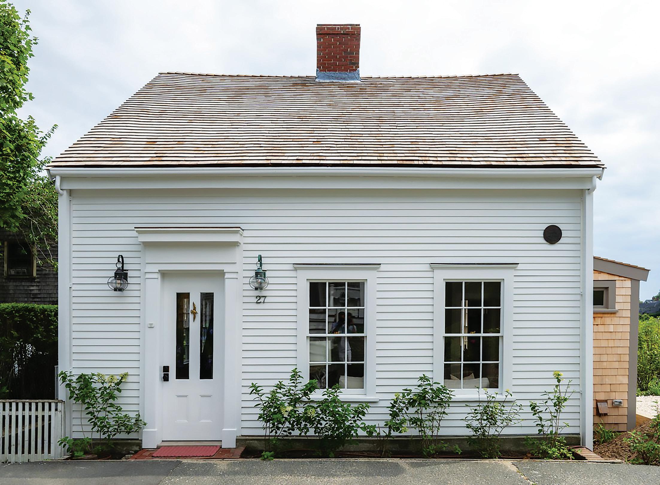 The exterior of 27 North Liberty St., which overlooks Lily Pond. When restoring the 200-plus-year-old building, preservation architect Michelle Kolb replaced the existing cedar shingles with the original white clapboard, and “a truly horrible Home Depot door” with a salvaged historic one.
