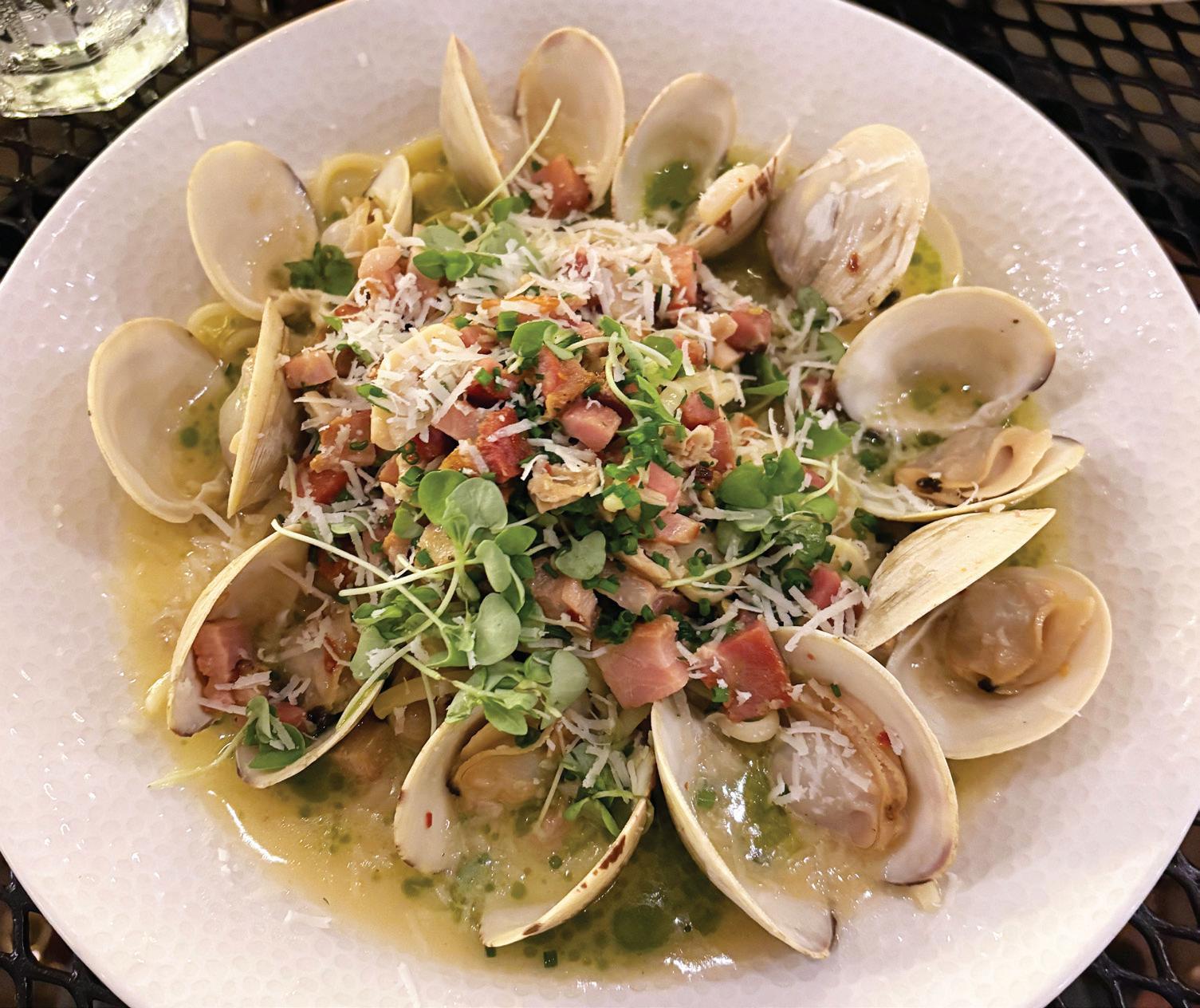 The linguine with clams overflows with shellfish and is finished with a buttery white wine sauce and crisp and salty pancetta.