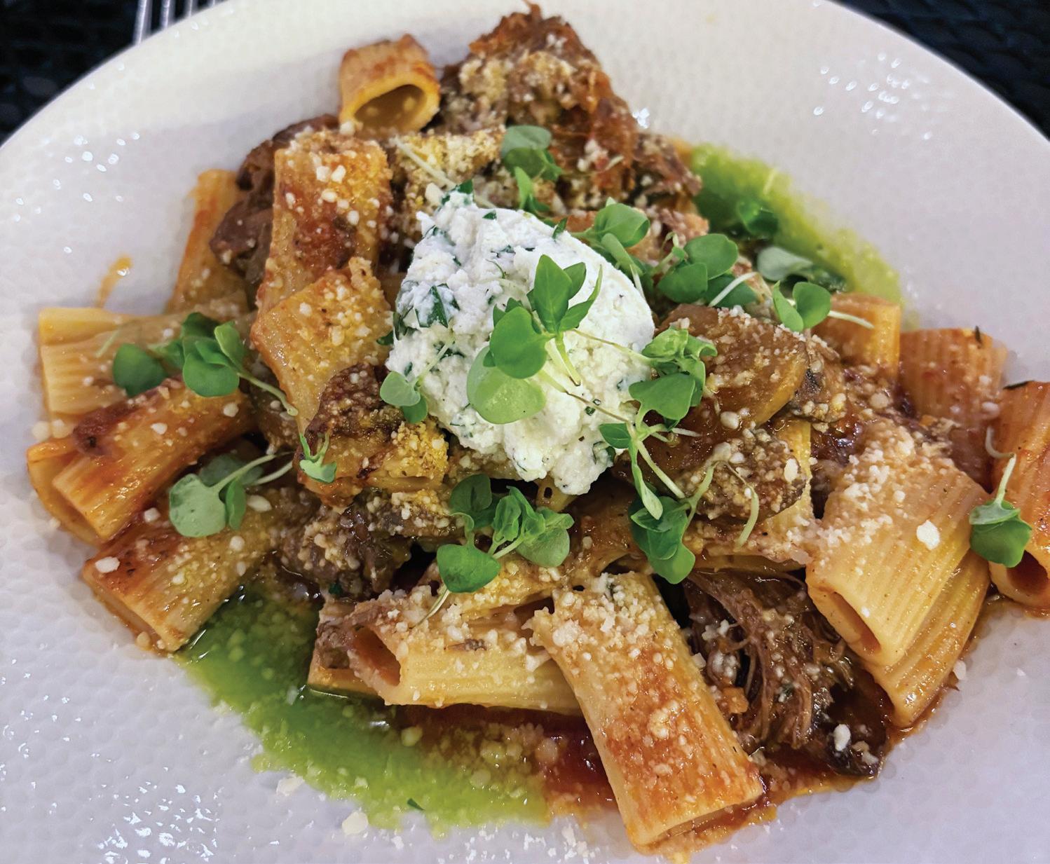 The rigatoni with shredded short rib contains thick chunks of melt-in-your-mouth short rib tossed with perfectly al dente pasta and sliced crimini mushrooms.