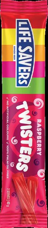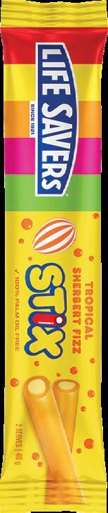 Life Savers Stix 40g range is available in two mouth-watering flavours, inspired by the #1 selling bag, Life Savers Mixed Sherbert Fizz Stix. Raspberry or Tropical flavoured tubes are filled with tangy sherbert fizz. The final new product is Life Savers Raspberry Twisters – long ropes, red in colour, with a soft, deliciously chewy texture. For more information contact The Distributors.