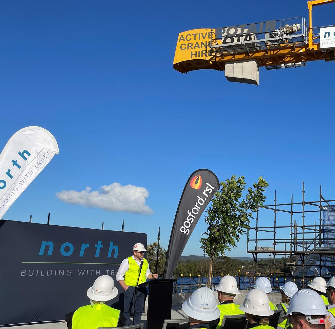 Gosford RSL recently marked a significant milestone in its redevelopment with a traditional tree-hoisting ceremony on the NSW Central Coast site. The event, on 5 May, officially marked the completion of all major structural works at the new club’s landmark building which is on track to open in early 2024.