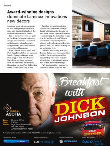 Award-winning designs dominate Laminex Innovations new decors Laminex Innovations continues to lead design inspiration with nine new decors that reflect the current international trends. Six of the new decors are part of the Plex Collection, offering design professionals the colour and character of real metals, alongside the practical, flexible properties of laminate. Plex Umbra, Plex Argent and Plex Graphite all feature varying levels of grey embossed hues. Plex Copper and Plex Copper DarkTone are bang on-trend with an embossed bronze look. Rounding out the Plex Collection is the classic-look Plex White.