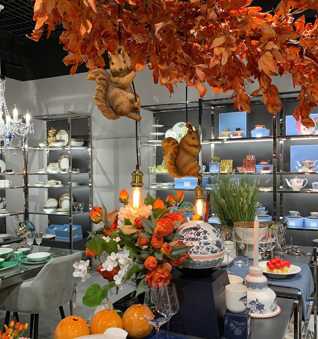 There are contemporary floor-to-ceiling iron and glass cabinets housing chinaware and décor accessories, and ladder-like wooden and iron racks displaying kitchen products. Couches, coffee tables and potted plants give the store a homely feel and also act as proposed living spaces, inspiring customers to picture changes to their own homes.