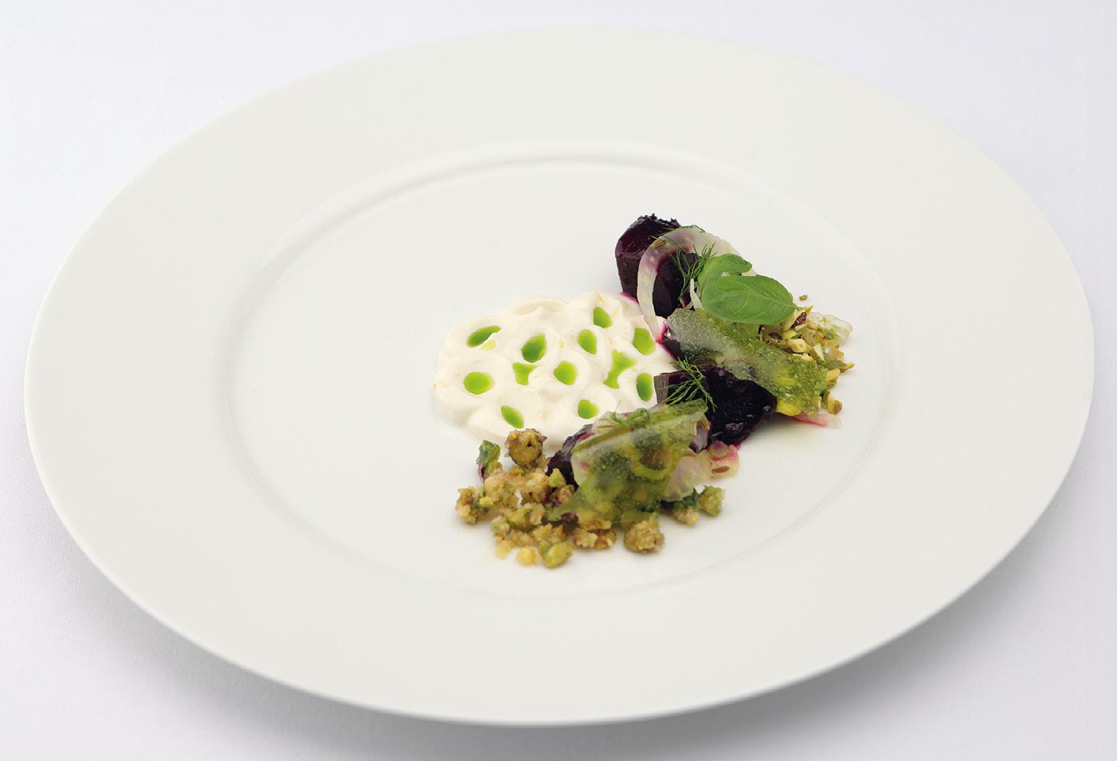 Morgan crafted a vegetarian entrée of BUONDI coffee smoked baby beets, whipped ricotta, fennel, basil wafer, and