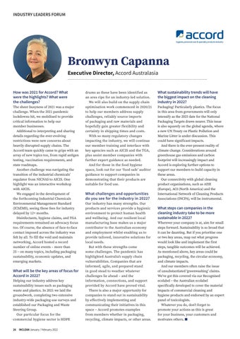 Bronwyn Capanna Executive Director, Accord Australasia How was 2021 for Accord? What were the highlights? What were the challenges? The sheer busyness of 2021 was a major challenge. When the 2021 pandemic lockdowns hit, we mobilised to provide critical information to help our member businesses. Additional to interpreting and sharing details regarding the ever-evolving restrictions were new concerns about heavily disrupted supply chains. The Accord team quickly came to grips with an array of new topics too, from rapid antigen testing, vaccination requirements, and state roadmaps. Another challenge was navigating the transition of the industrial chemicals’ regulator from NICNAS to AICIS. One highlight was an interactive workshop with AICIS. We engaged in the development of the forthcoming Industrial Chemicals Environmental Management Standard (IChEMS), seeing these fees for industry delayed by 12+ months. Disinfectants, hygiene claims, and TGA requirements remained an advocacy focus too. Of course, the absence of face-to-face contact imposed across the industry was felt by all. To fill the void and maintain networking, Accord hosted a record number of online events – more than 25 – on many topics, including packaging sustainability, economic updates, and emerging markets.