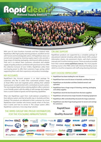 WHY CHOOSE RAPIDCLEAN? RapidClean has been trading for over 30 years RapidClean have over 65 stores in Australia and New Zealand RapidClean are Australian and New Zealand owned and operated RapidClean have a huge range of cleaning, catering, packaging and safety supplies RapidClean stock the best brands from the best suppliers RapidClean sell and service major brands of cleaning equipment RapidClean offer centralised Key Accounts for large customers RapidClean uses their huge buying power to secure cost savings for customers