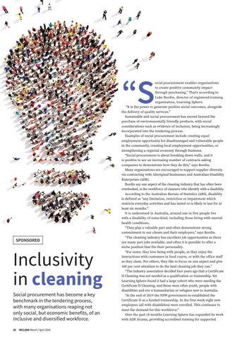 Inclusivity in cleaning Social procurement has become a key benchmark in the tendering process, with many organisations reaping not only social, but economic benefits, of an inclusive and diversified workforce. 30 INCLEAN March / April 2020
