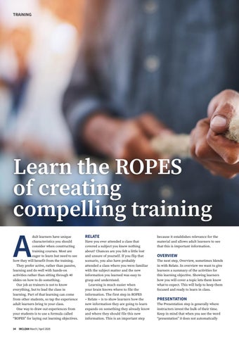 dult learners have unique characteristics you should consider when constructing training courses. Most are eager to learn but need to see how they will benefit from the training. They prefer active, rather than passive, learning and do well with hands-on activities rather than sitting through 40 slides on how to do something. Our job as trainers is not to know everything, but to lead the class in learning. Part of that learning can come from other students, so tap the experience adult learners bring to your class. One way to draw out experiences from your students is to use a formula called “ROPES” for laying out learning objectives. 34 INCLEAN March / April 2020
