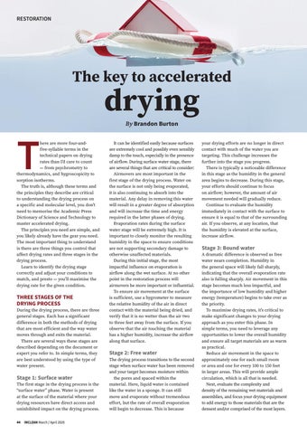 Stage 3: Bound water A dramatic difference is observed as free water nears completion. Humidity in the general space will likely fall sharply, indicating that the overall evaporation rate also is falling sharply. Air movement in this stage becomes much less impactful, and the importance of low humidity and higher energy (temperature) begins to take over as the priority. To maximise drying rates, it’s critical to make significant changes to your drying approach as you enter this phase. In simple terms, you need to leverage any opportunities to lower the overall humidity and ensure all target materials are as warm as practical. Reduce air movement in the space to approximately one for each small room or area and one for every 100 to 150 feet in larger areas. This will provide ample circulation, which is all that is needed. Next, evaluate the complexity and density of the remaining wet materials and assemblies, and focus your drying equipment to add energy to those materials that are the densest and/or comprised of the most layers.