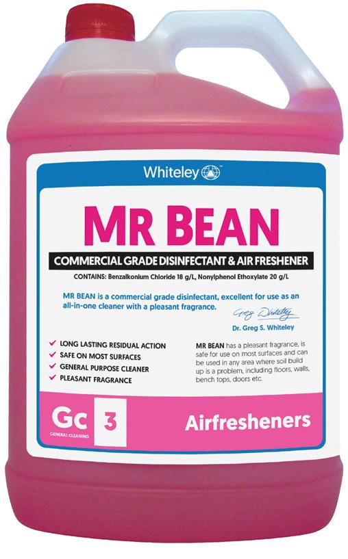 Mr Bean is an easy-to-use concentrated water-based air-freshener, general purpose cleaner and commercial grade disinfectant! Mr Bean has a pleasant fragrance, is safe for use on most surfaces and can be used in any area where soil build up is a problem, including floors, walls, benchtops, doors. The long-lasting residual action of Mr Bean makes it excellent for use as an all-in-one cleaner!