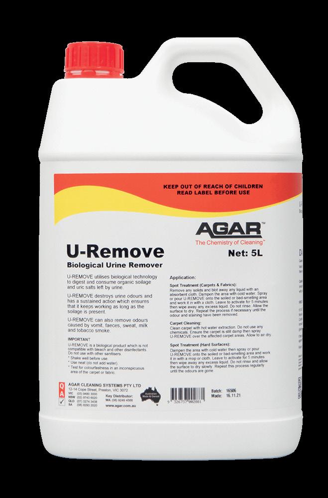 U-Remove is a unique stain and odour remover that utilises advanced biologically active ingredients to digest and consume organic soilage and uric salts left by urine, vomit, and faeces in carpets, underlay, mattresses, curtains and synthetic grass. With a pleasant fresh fragrance to help mask unwanted smells, the good bacteria in the aqueous solution keep on digesting the stains until the soilage is gone. U-Remove is also effective on hard surfaces such as concrete, brick, wood, walls and floors and is ideal for areas where recurring urine odours are an issue.