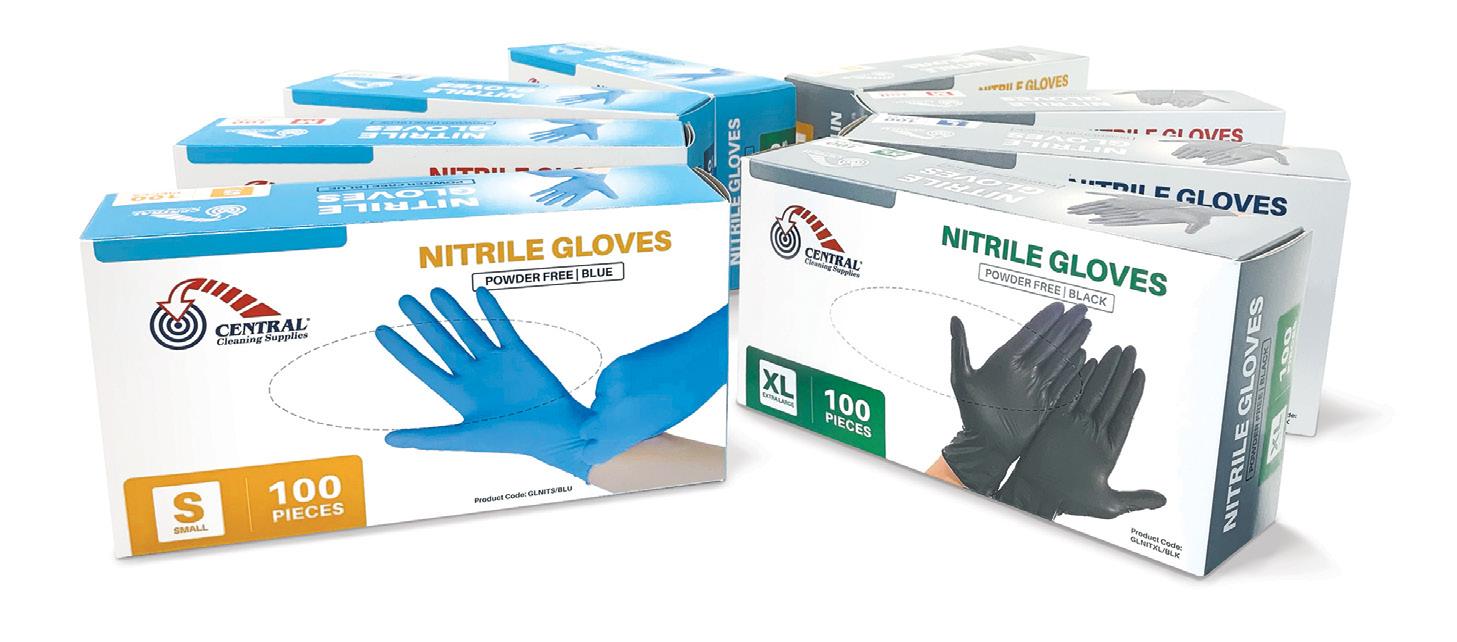 New from Central Cleaning Supplies is a range of disposable Nitrile Gloves that are ideal for use in many types of applications. They are latex free, chemical resistant, ambidextrous, and finger textured. Available powder free in packs of 100, blue or black and in sizes ranging from small, medium, large, to extra-large.