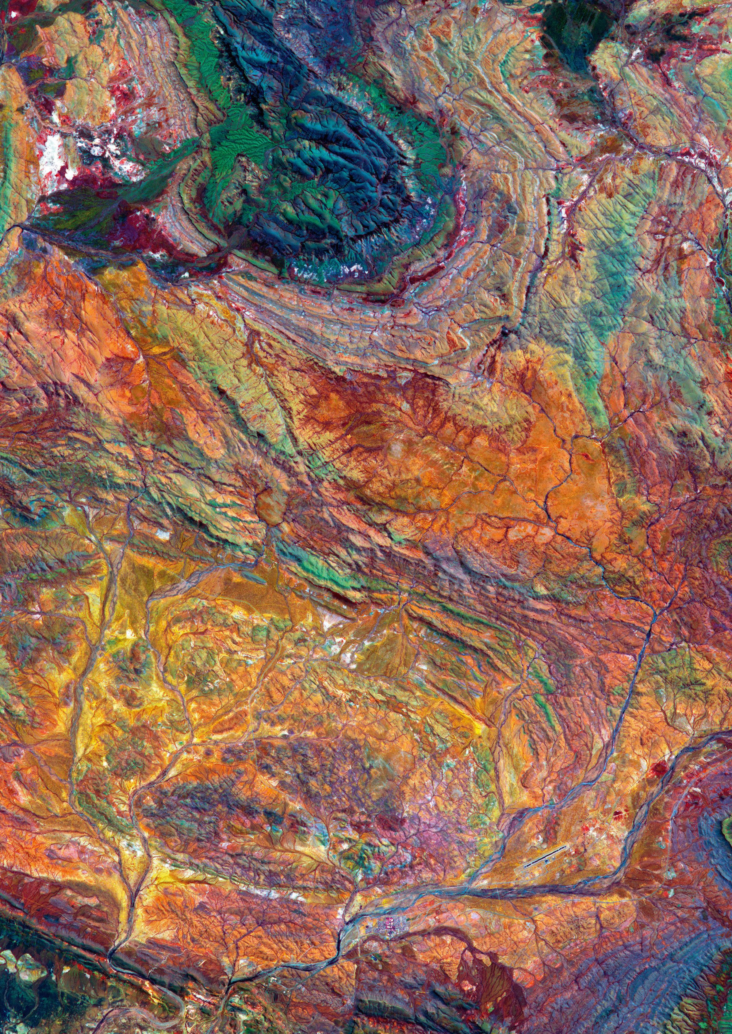 This amazing false-colour image of rock formations in the Hamersley Basin in Western Australia was acquired by the Advanced Spaceborne Thermal Emission and Reflection Radiometer (ASTER) on NASA’s Terra satellite. ASTER is a 15-channel imaging instrument; its data are used to produce detailed maps of parameters such as land elevation and surface temperature.