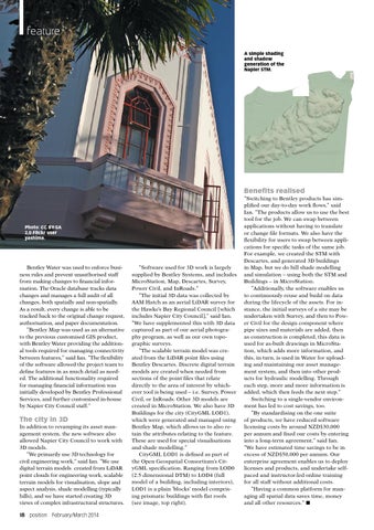 “Switching to Bentley products has simplified our day-to-day work flows,” said Ian. “The products allow us to use the best tool for the job. We can swap between applications without having to translate or change file formats. We also have the flexibility for users to swap between applications for specific tasks of the same job. For example, we created the STM with Descartes, and generated 3D buildings in Map, but we do hill shade modelling and simulation – using both the STM and Buildings – in MicroStation. “Additionally, the software enables us to continuously reuse and build on data during the lifecycle of the assets. For instance, the initial surveys of a site may be undertaken with Survey, and then to Power Civil for the design component where pipe sizes and materials are added, then as construction is completed, this data is used for as-built drawings in MicroStation, which adds more information, and this, in turn, is used in Water for uploading and maintaining our asset management system, and then into other products for hydraulic modelling. Through each step, more and more information is added, which then feeds the next step.” Switching to a single-vendor environment has led to cost savings, too. “By standardising on the one suite of products, we have reduced software licensing costs by around NZD$30,000 per annum and fixed our costs by entering into a long-term agreement,” said Ian. “We have estimated time savings to be in excess of NZD$50,000 per annum. Our enterprise agreement enables us to deploy licenses and products, and undertake selfpaced and instructor-led online training for all staff without additional costs. “Having a common platform for managing all spatial data saves time, money and all other resources.” ■