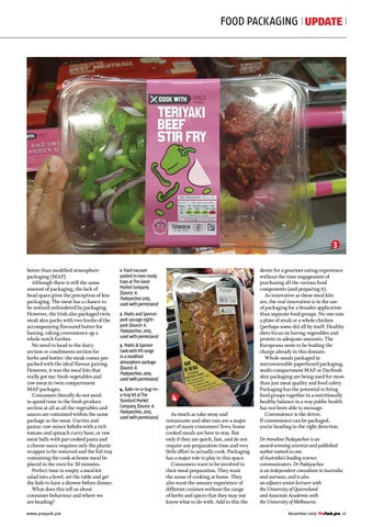 desire for a gourmet eating experience without the time engagement of purchasing all the various food components (and preparing it). As innovative as these meal kits are, the real innovation is in the use of packaging for a broader application than separate food groups. No one eats a plate of steak or a whole chicken (perhaps some do) all by itself. Healthy diets focus on having vegetables and protein in adequate amounts. The Europeans seem to be leading the charge already in this domain. Whole meals packaged in microwaveable paperboard packaging, multi-compartment MAP or Darfresh skin packaging are being used for more than just meat quality and food safety. Packaging has the potential to bring food groups together in a nutritionally healthy balance in a way public health has not been able to message. Convenience is the driver. If convenience can be packaged, you’re heading in the right direction. Dr Anneline Padayachee is an award-winning scientist and published author named as one of Australia’s leading science communicators. Dr Padayachee is an independent consultant in Australia and overseas, and is also an adjunct senior lecturer with the University of Queensland and Associate Academic with the University of Melbourne. December 2019 ProPack.pro 27