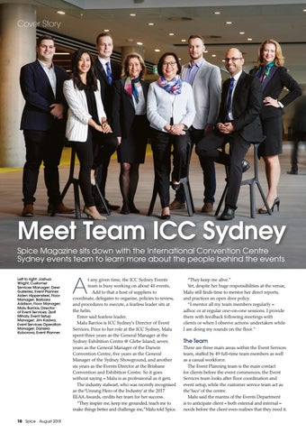 Meet Team ICC Sydney Spice Magazine sits down with the International Convention Centre Sydney events team to learn more about the people behind the events Left to right: Joshua Wright, Customer Services Manager; Dewi Gutierrez, Event Planner; Aiden Hippensteel, Floor Manager; Barbara Addison, Floor Manager; Malu Barrios, Director of Event Services; Zsolt Mihaly, Event Setup Manager; Jim Kadwa, Event Services Operation Manager; Daniela Koborova, Event Planner.
