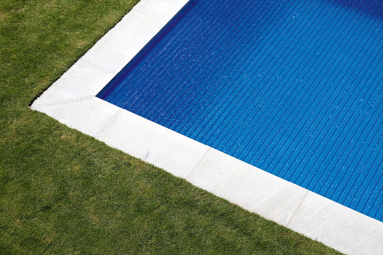 It comes in various finishes for pools including sandblasted for floor, walls, coping, drain grates and decks; and honed, famed brushed, bush hammered and polished for walls.