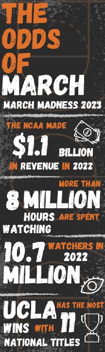 March Madness is the nickname for the official NCAA Division 1 Men’s Basketball Tournament, getting the name from Illinois high school official Henry V. Porter in 1939. The tournament consists of the best college teams going head to head, competing for the title of National Champions. 360+ college basketball teams compete to qualify for the tournament, with only 68 teams being able to actually play. The tournament then starts, eliminating teams in the span of 7 rounds. Some of these rounds have iconic names, including the “Sweet Sixteen,” “Elite Eight” and the “Final Four.” The process of teams entering the tournament happened on “Selection Sunday,” which was on