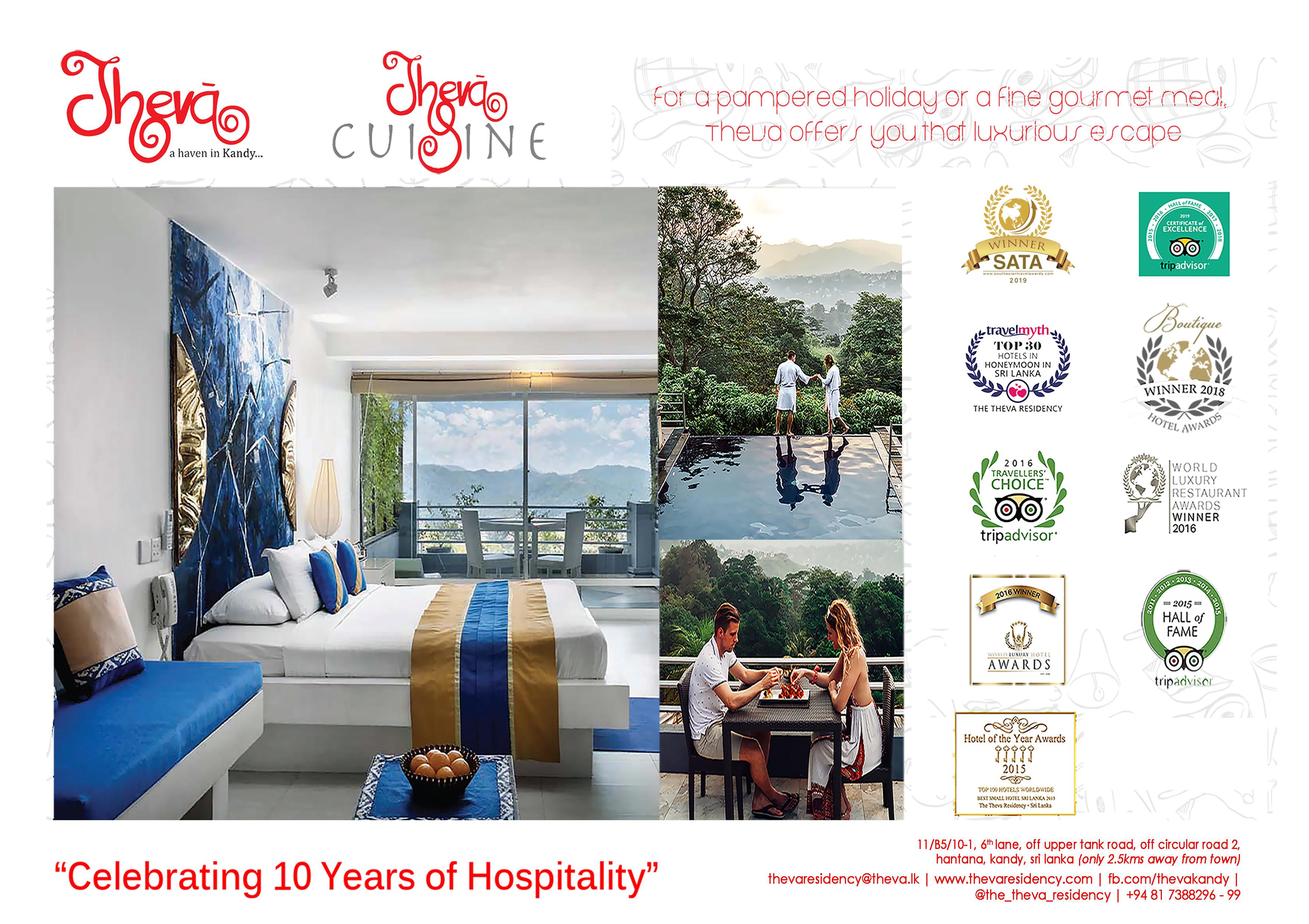 The Theva Residency, Kandy won the Gold Award for “Leading Boutique Hotel in South Asia” and the Silver Award for “Leading Boutique Hotel in Sri Lanka” and the Silver Award for “Most Romantic Resort in Sri Lanka” for 2019 at the South Asia Travel Awards (SATA) held at Amari Galle, Sri Lanka. The SATA Awards is the first ever regional Travel Awards endorsed by Multi National Associations providing the Tourism sector of the South Asian Region with recognition towards their facilities and service excellence. The South Asian Travel Awards aims to