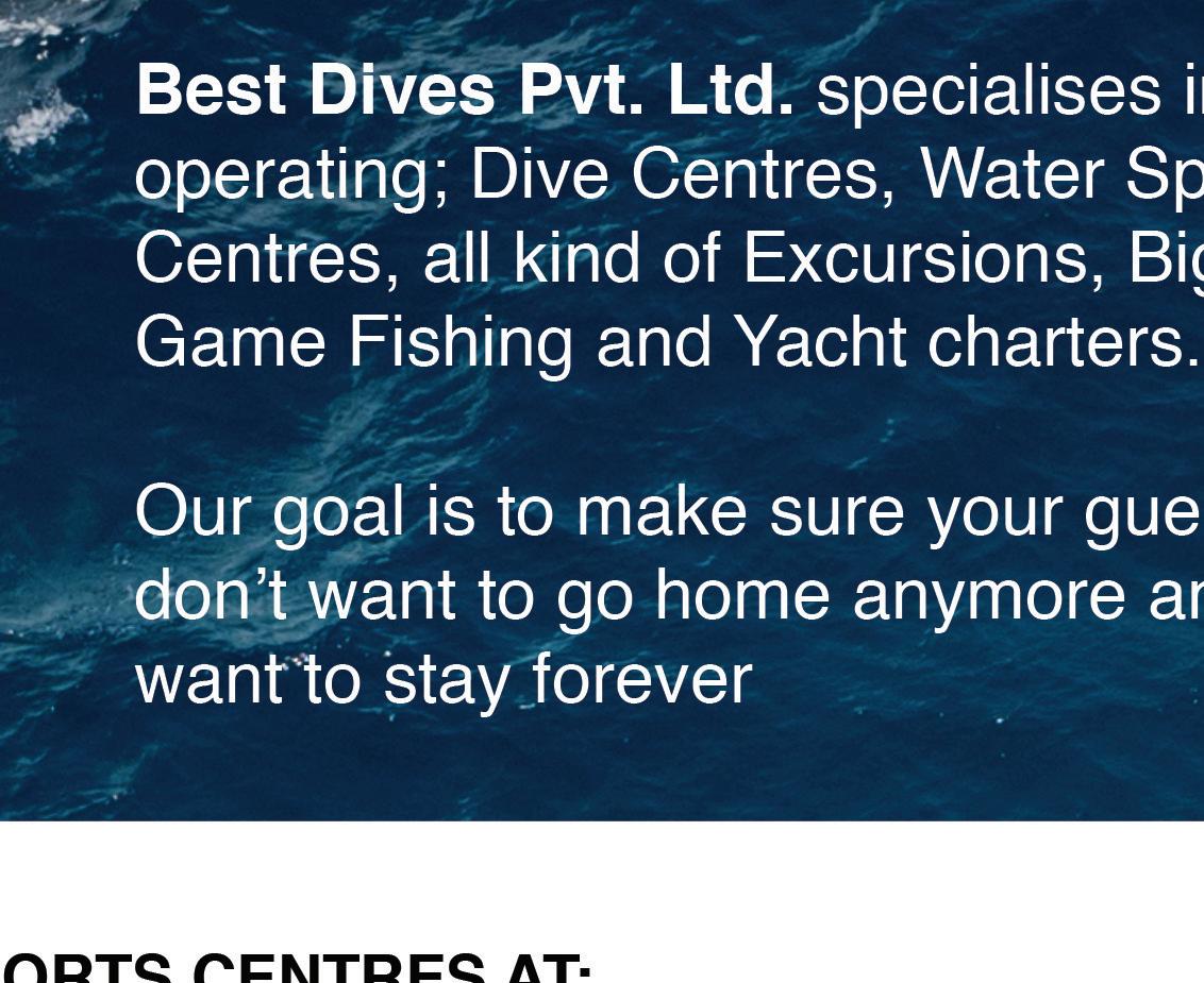 Best Dives operates Dive & Water Sports centres and o ers Excursions on 5* luxury resorts in Maldives. ey also charter Luxury Yachts and provides guests with transfers through their sister company Best Yachts Maldives Pvt. Ltd. from airport to resort.