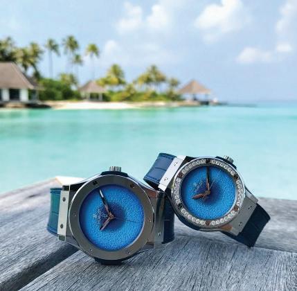 According to Hublot the new watch is a timepiece tribute to the colours of the surrounding Noonu atoll, where the ocean’s dark blue contrasts beautifully with the limpid turquoise of the lagoon, all a re ection of the clear blue skies above.