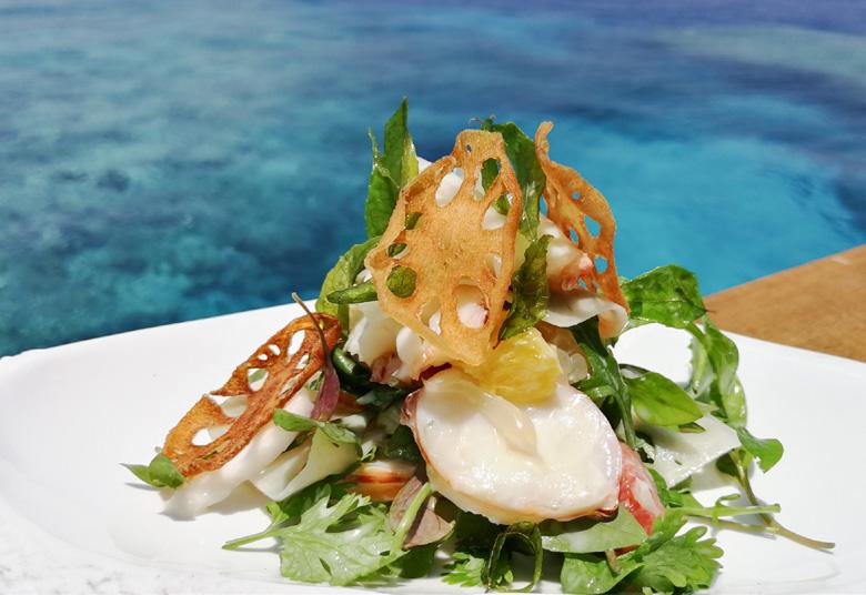 Lobster salad made with Lobster medallions, lotus root, pomelo, young coconut, orange, grape fruit , fresh coriander, Dressing made with coriander, coconut milk, infuse spices, lime