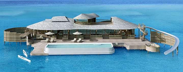 Both, the 584 sqm. One Bedroom Water Retreat with Slide, and the 857 sqm. (9,224 sqft) Two Bedroom Water Retreat with Slide come with a private pool and a curving slide that plunges directly into the Indian Ocean. With a choice of sunrise or sunset views, the villas feature a large al fresco deck, including plush sun loungers, a sunken seating area and catamaran nets over the ocean. Both villa types feature a spacious upper level with a dining area
