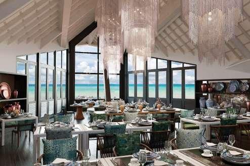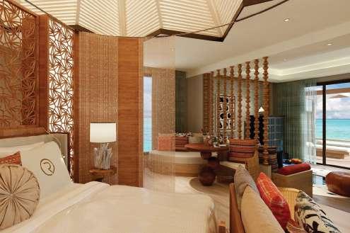 The use of rich rainforest-green marble for the floors of villas, elegant handwoven fabric wallpaper and ornate décor highlight elegance and grandeur. All 90 secluded villas and Reserves, located overwater and beachfront, have been completely renovated with fabulous additions such as walk-in wardrobes, glass-enclosed air-conditioned bathrooms, and exotic open-air bathtubs. Lattice screens elegantly placed on headboards of the beds and in the master bathrooms of the suites add a graceful touch to the ultra-luxurious villas.