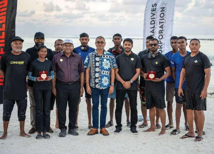 The event was distinguished by its spirit of collaboration, with four marine biologists from neighboring resorts—including Joali Being, Westin, Coco Palm, and Dusit Thani — joining the effort. The visiting experts, Philippa Darby-shire Jenkins from Joali Being, Rosalie Bailie from Coco Palm, Harry Longin from Westin, and Louna Marchand from Dusit Thani, participated in hands-on coral transplantation dives,