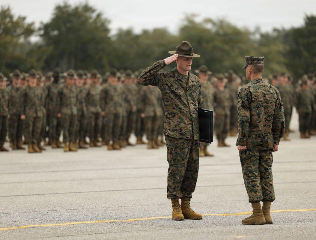 U.S. Marine Corps Sgt. Maj. Erick Smack, Sergeant Major, Recruit Training Regiment, salutes Col. Anthony P. Bariletti, Commanding Officer, RTR, in front of Marines in formation on Tuesday, Jan. 6, 2026, on Peatross Parade Deck, Marine Corps Recruit Depot Parris Island. Marines from around the depot were there attending a meritorious promotion ceremony in which 11 drill instructors with RTR were meritoriously promoted to the next rank. Cpl. Jacob Richardson/USMC