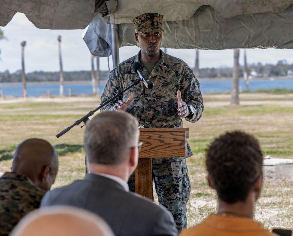 U.S. Marine Brig. Gen. Ahmed T. Williamson, the commanding general of Marine Corps Recruit Depot Parris Island, and the Eastern Recruiting Region, speaks to guests Thursday, March 5, 2026, during the Traditions groundbreaking ceremony on Marine Corps Recruit Depot Parris Island. The new Traditions, a restaurant welcoming all ranks and their families, is set to open summer of 2027. Cpl. Noelia Vazquez/USMC